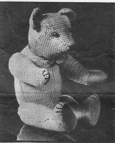 Weldons 21: Teddy in Crochet: Great teddy crochet pattern from the late 1920s, no size given, worked in crochet, soft wool and soft filling, very cuddly - all instructions included. This little fellow is jointed so it is suggested that you use child saftey locking joints and saftely eyes available from ebay or any fabric or craft shop. Wait untill he is complete then see what size is needed. If he is to be collectors bear, not for a child then it would be nice to use the authentic cardboard discs and glass eyes suggested.