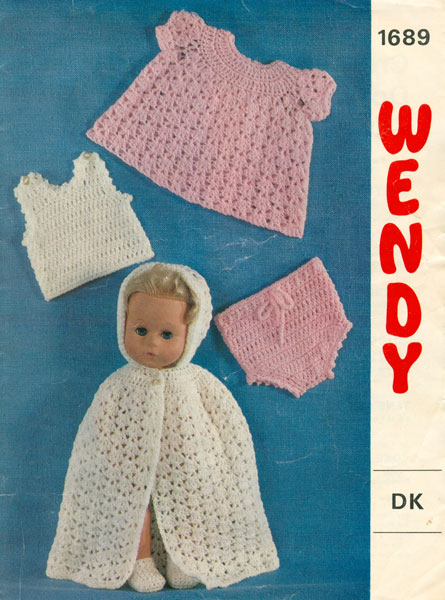 Wendy 1689: Great vintage CROCHET dolls pattern to fit a 14" doll worked in double knitting yarn. Dress panties and vest with cape and shoes. 1970's In great used condition.