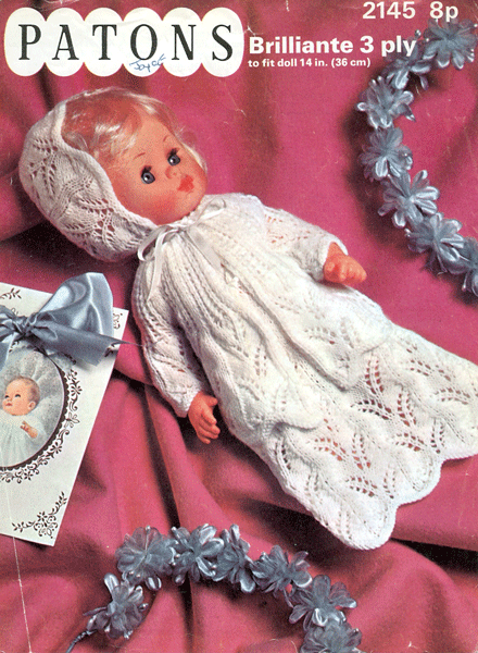 Patons 2145:Vintage knitting pattern for dolls christening outfit. This lovely pattern has instructions for long or short dress, matinee and bonnet to fit a 14" doll in 3ply. pdf £1.50, email sue@fab40s.co.uk |